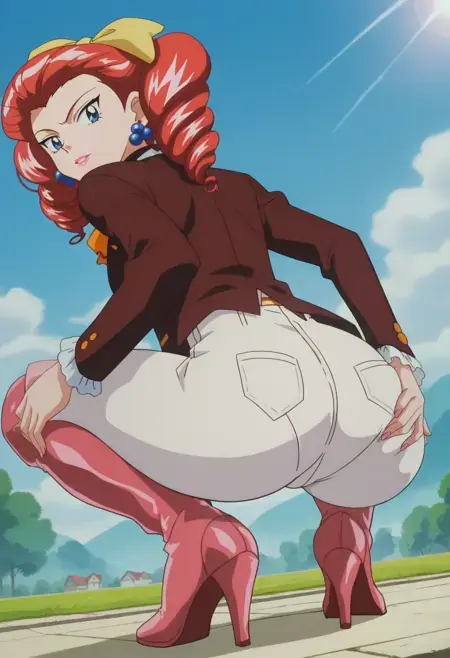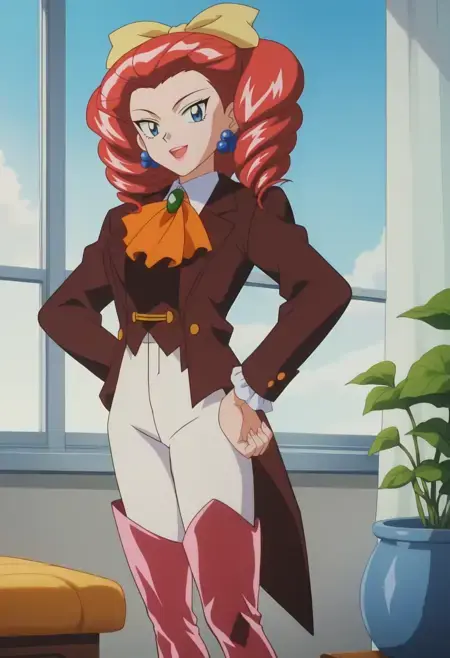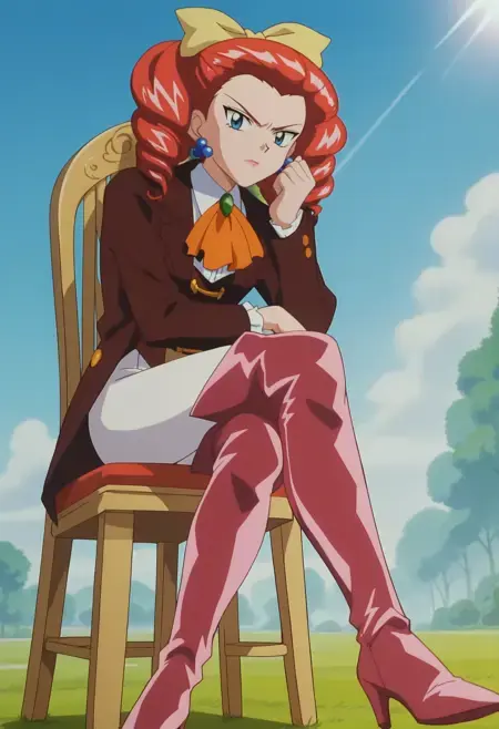 茶色のジャケット、オレンジのアスコット、白いズボン、太ももブーツ、ハイヒールブーツ
