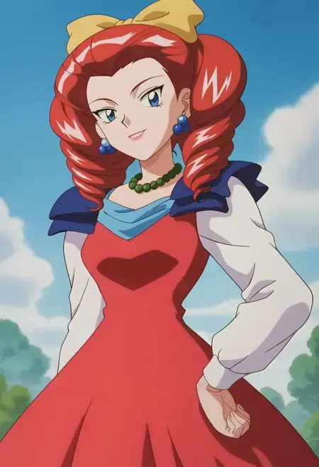 PMJessebelle、青い目、赤い髪、ドリル髪、黄色いリボン、髪のリボン、イヤリング、口紅、ピンクの唇