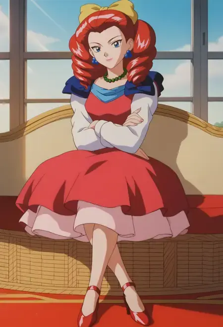 パールネックレス、赤いドレス、ショルダーパッド、ハイヒール、赤い靴