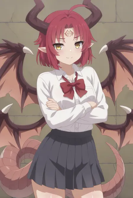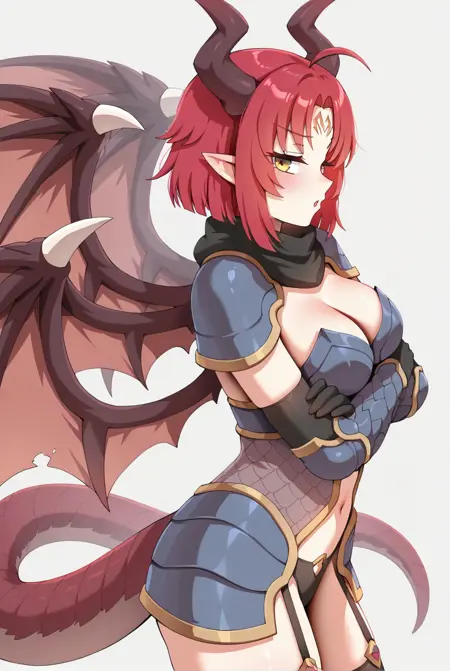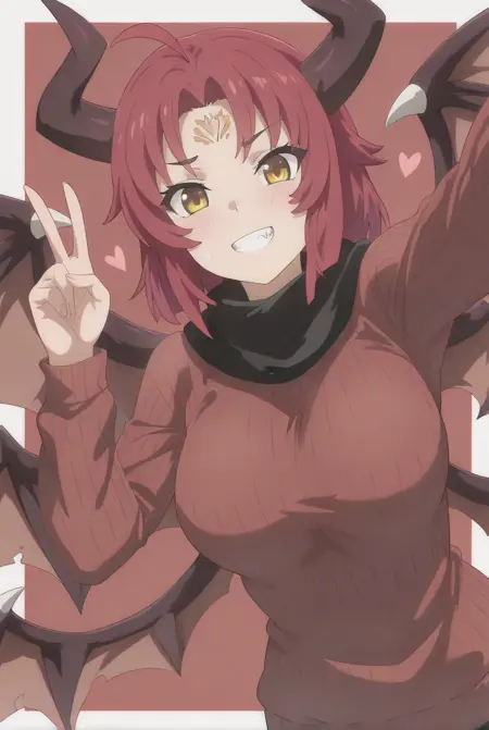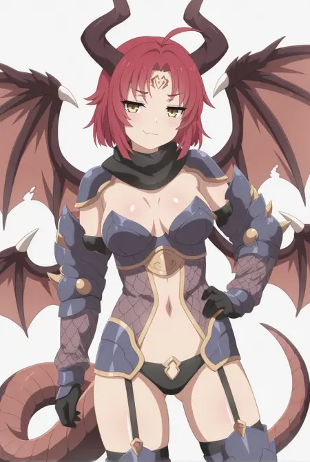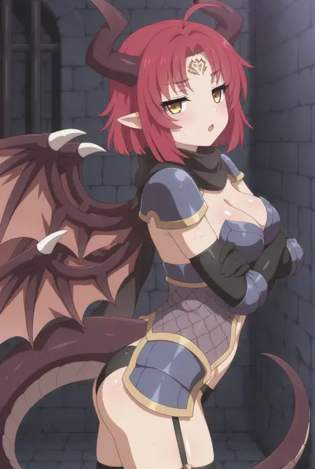 ベスタの外見: vesta_(sakura_dungeon)、大きな胸、黄色い目、短い髪、赤い髪、あほ毛、顔の模様、ドラゴンの角、ドラゴンの尾、ドラゴンの翼、複数の翼、ドラゴンガール