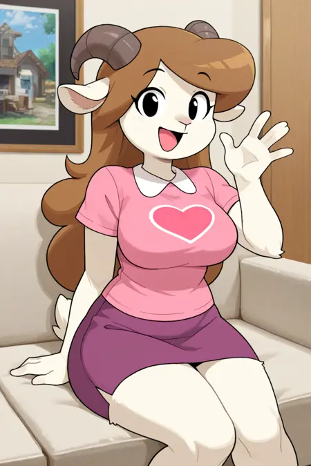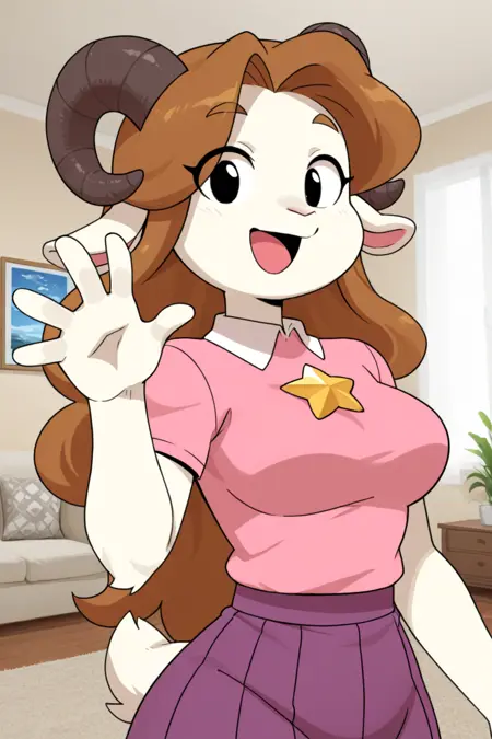 프롬프트: 1girl, anthro, furry female, goat, chun-ni, brown hair, long hair, black eyes, horns, pink shirt, purple skirt,