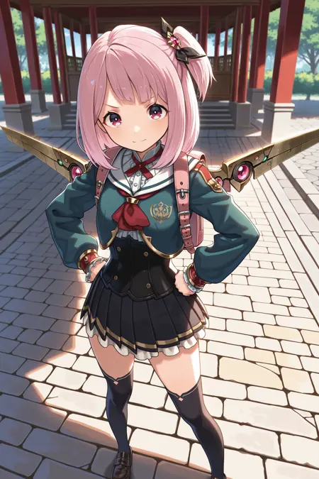유니폼: 하트 브로치, 검은 재킷, 금장식, 줄리엣 소매, 한쪽 어깨 갑옷, 크롭탑, 흰색 셔츠, 칼라 셔츠, 프릴, 코르셋, 분홍 치마,
