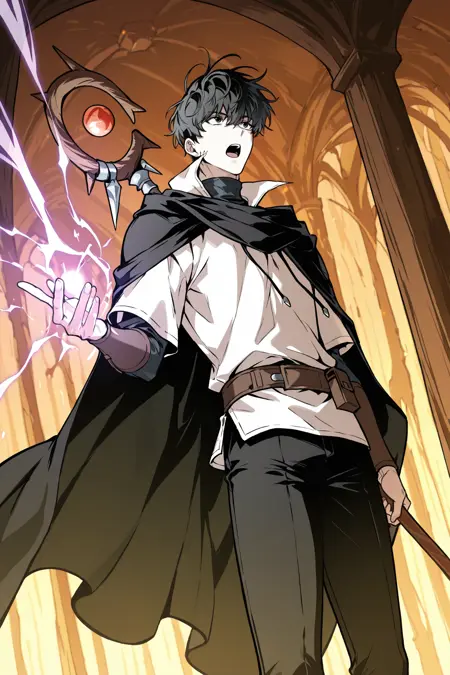 シャツの下にシャツ、黒シャツ、白シャツ、タートルネック、高めの襟、黒いマント、黒パンツ