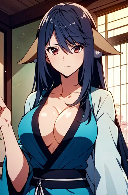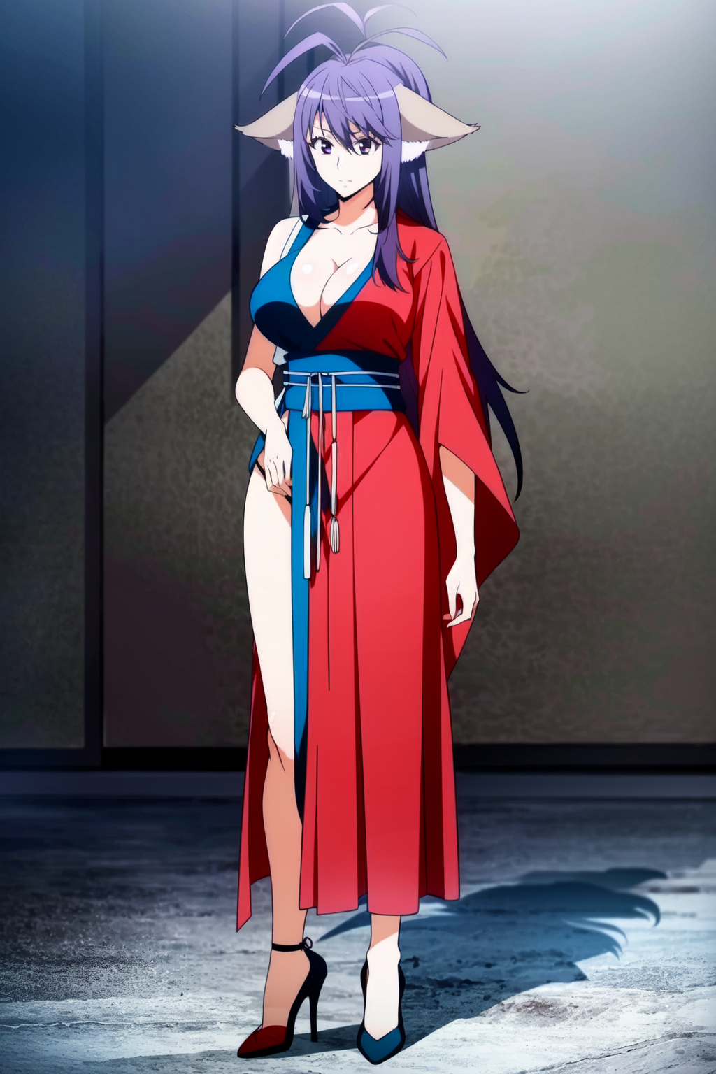 Tushan Yaya, 1girl, solo, animal ears, breasts, long hair, cleavage, high heels, large breasts, full body, purple hair, antenna hair, shoes, sash
