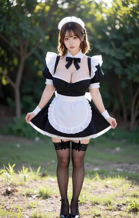 trigger:1girl, breasts, solo, maid, maid headdress, long hair, huge breasts, apron, cleavage, thighhighs, brown hair, looking at viewer, lips, parted lips, frills, no panties, thighs, waist apron, indoors, black dress, realistic, thick thighs, dress, detached sleeves, areola slip, maid apron, curvy, bare shoulders, detached collar, standing, white apron, frilled thighhighs