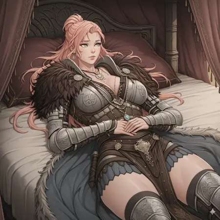 kzelamaine, realistic, 1girl, solo, long hair, pink hair, jewelry, necklace, earrings, fur trim, armor, thighhighs, shoulder armor, pelvic curtain,