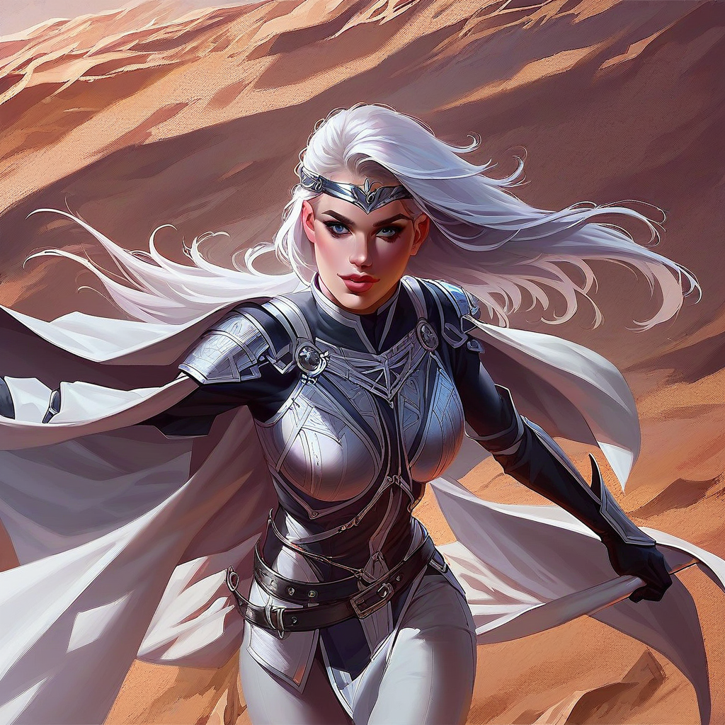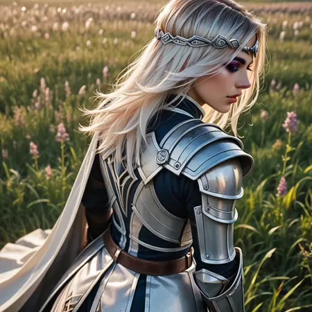 silver cleric armor with a cape and black gloves and a belt