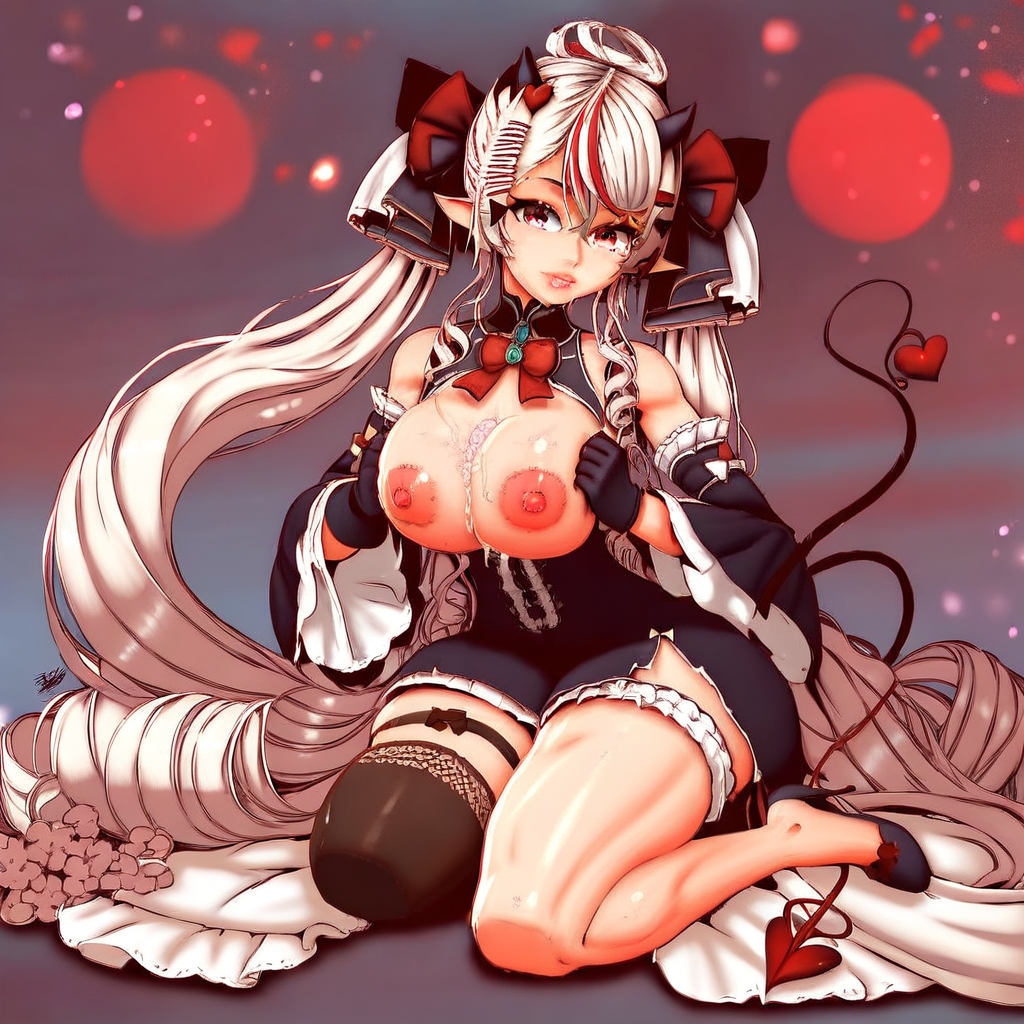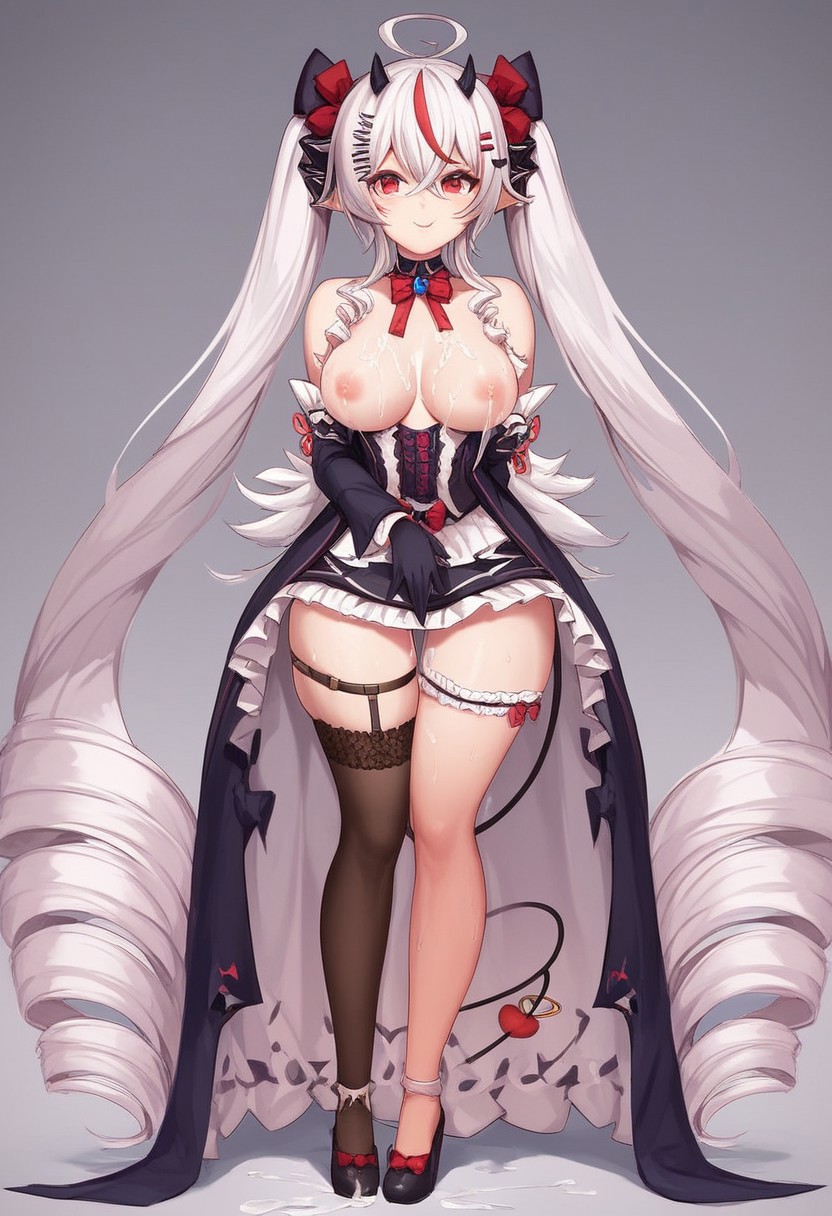 (VTuber_레미리아, 긴 머리, 다색 머리, 줄무늬 머리, 빨간 머리, 하얀 머리, 빨간 눈, 뾰족한 귀, 뿔, 악마 꼬리, 머리 장신구, 드레스, 활, 분리형 소매, 장갑, 허벅지 스트랩, 한쪽 허벅지 스타킹, 하이힐)