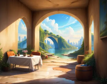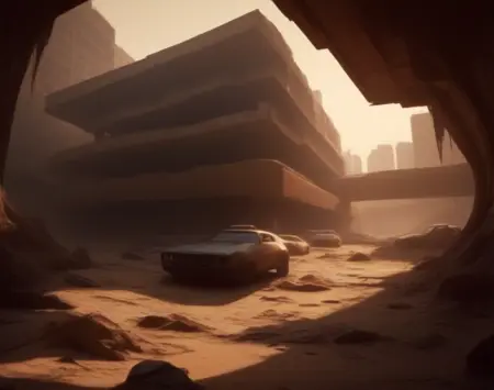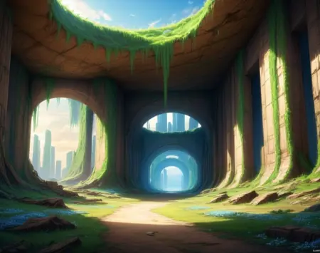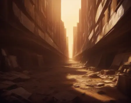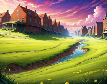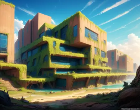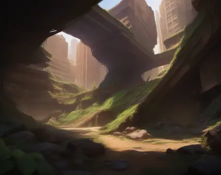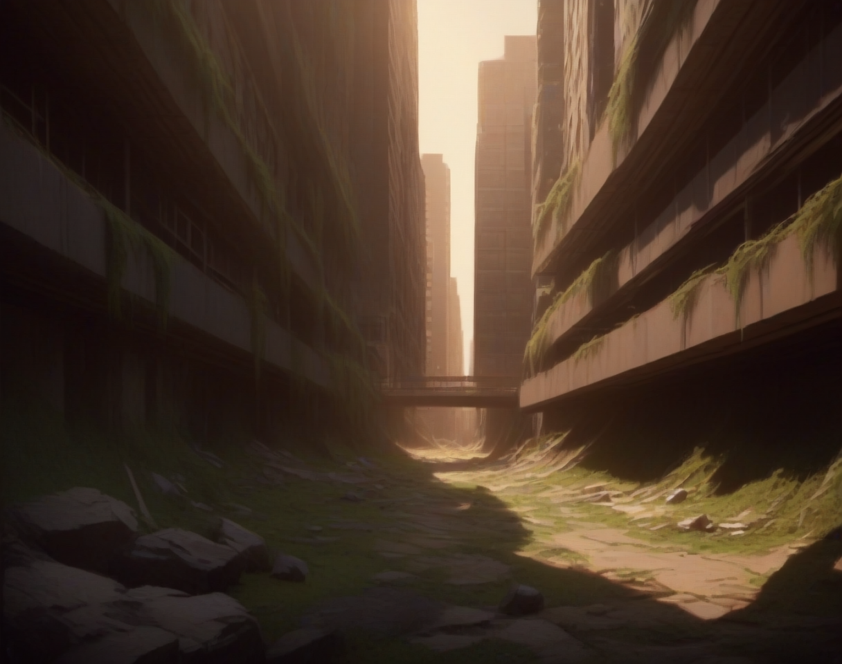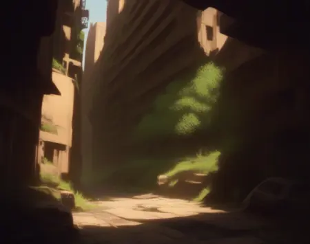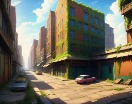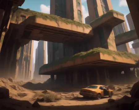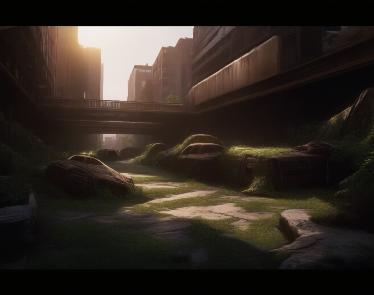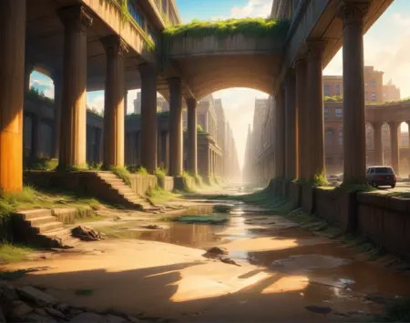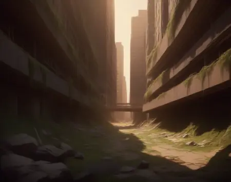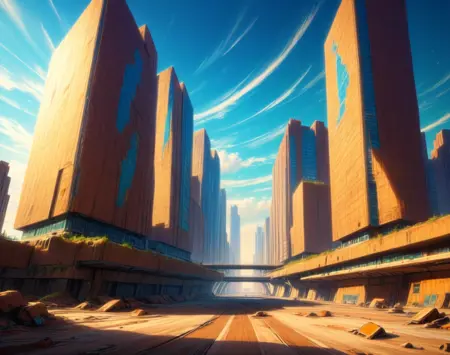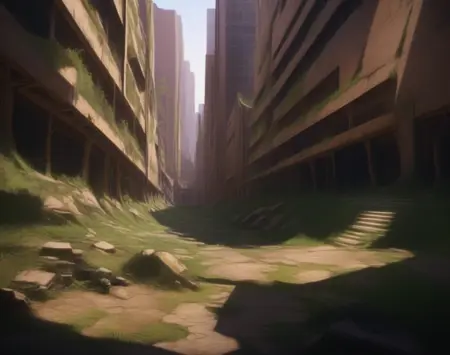 このLoRA用のプロンプトは(PostApocalypticCity, background, landscape)です。