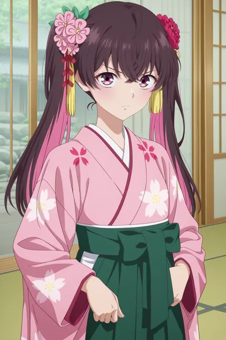 yaotome sakura, long hair, twintails, colored inner hair, brown hair, pink hair, tsumami kanzashi, crossed bangs, purple eyes, long sleeves, furisode, pink kimono, green hakama, hakama pants, waist bow, tabi, zouri