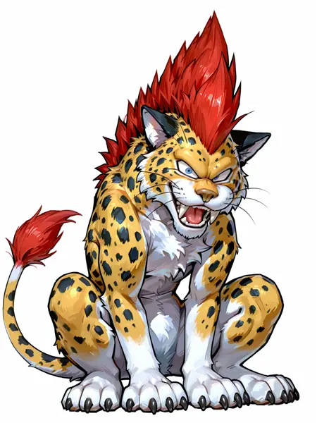 four toes, blue eyes, white sclera, keen eyes, huge fangs, sharp teeth, muzzle, brown nose, black ears, cat whiskers, no horns, red mane, chest tuft, white stomach, quadrupedal, white feet, black claws, thin tail, red tuft at the end of the tail, yellow body, white fur, furry fur, black spots pattern body,optional posture words