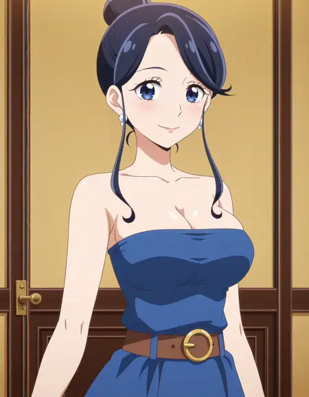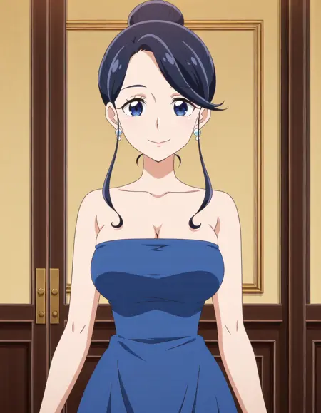 アニメスクリーンキャップ、単体、1人の女の子、青空夢純、青いドレス、チューブトップ、イヤリング、lora:aokazemutsumi_IL:0.8 高解像度、素晴らしい品質、最上品質、非常に審美的、傑作、absurdres、