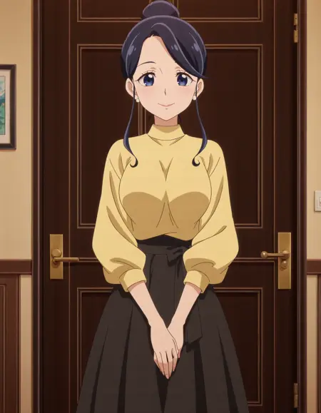 アニメスクリーンキャップ、単体、1人の女の子、青空夢純、黄色のシャツ、長いスカート、黒いスカート、lora:aokazemutsumi_IL:0.8 高解像度、素晴らしい品質、最上品質、非常に審美的、傑作、absurdres、