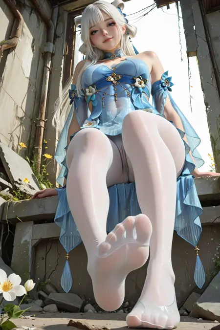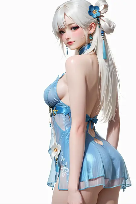 - 13878w,blue dress,dress,flower,detached sleeves,jewelry,bare shoulders,flat shoes,microdress,