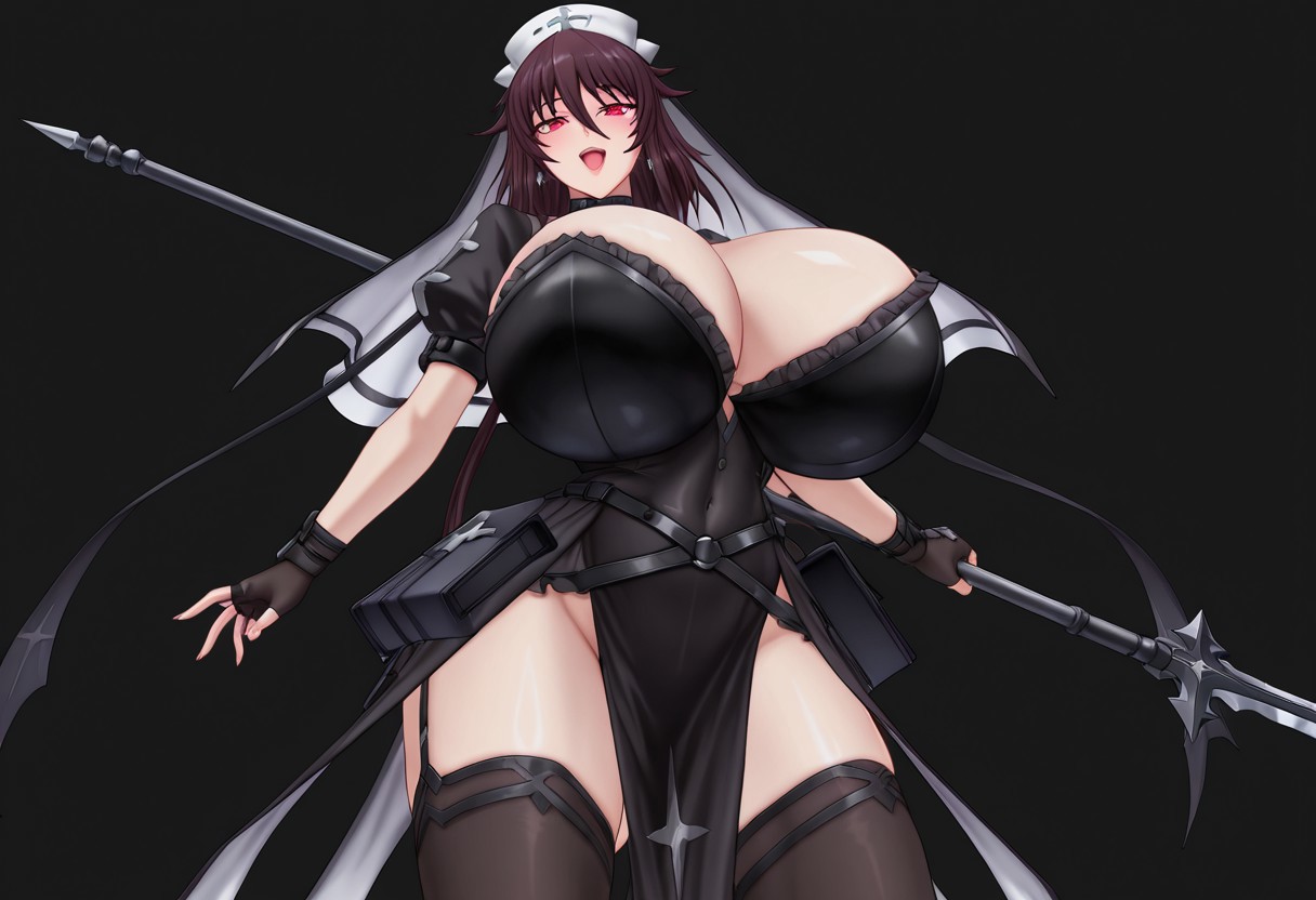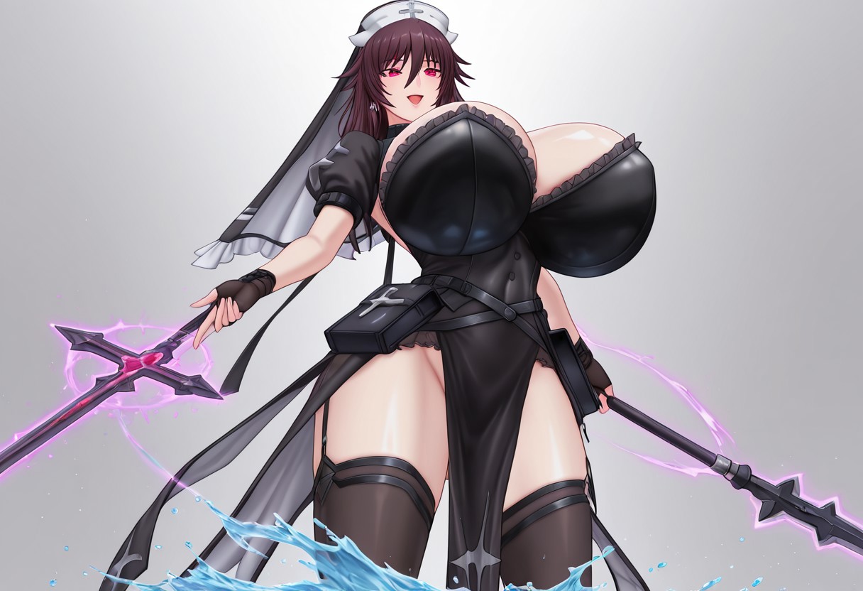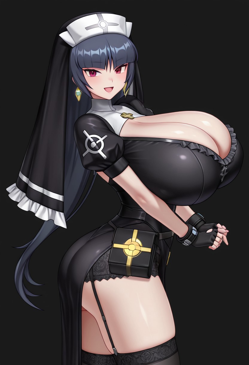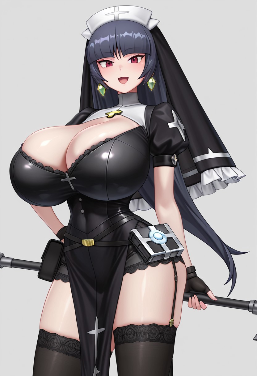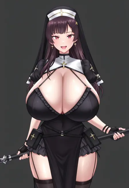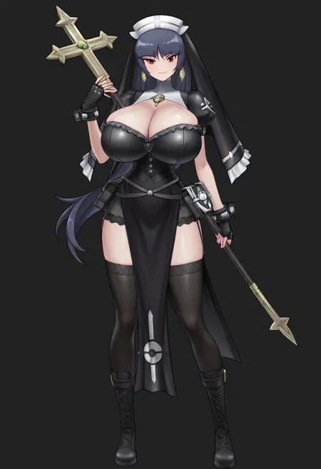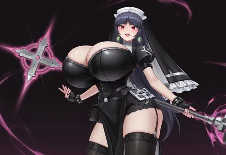 태그: PACostume, 검은 드레스, 수녀, 가슴 노출, 십자가, 귀걸이, 검은 허벅지 스타킹, 스트랩, 검은 장갑, 풍선 짧은 소매,