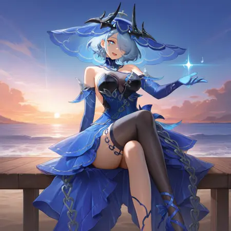 RebeccaDNA, Rbc_Drs, 头发遮住一只眼睛, 泪滴纹身, 耳环, 浅蓝色头发, 中长发, 蓝色头饰, 蓝色面纱, 面纱, 角, 黑色角, 蓝色护喉甲, 露肩, 银色链条, 透明胸部露肤, 胸部露肤, 黑色胸衣, 胸衣, 无肩带连衣裙, 蓝色连衣裙, 分层裙摆, 荷叶边裙摆, 前短后长裙摆, 单侧过膝袜, 黑色过膝袜, 分离式袖子, 蓝色袖子, 银色镶边, 双色袖子, 黑色袖子, 带袖手套, 蓝色指套, 音符图案,