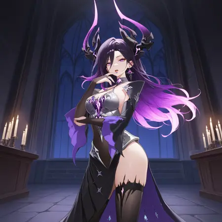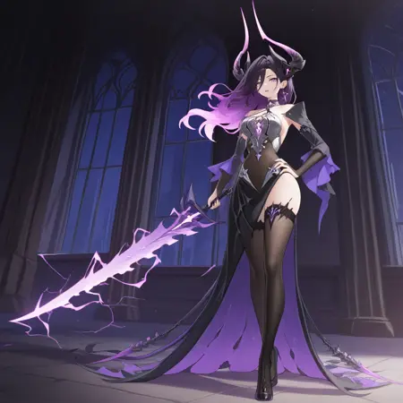 SibylleDNA, グラデーションホーン, ホーン, グラデーションヘア, 黒髪, 光る髪, 長髪, 紫髪, 紫色の目, ハルタネック, 灰色のカラー, 長袖, 片耳用イヤリング, 黒い袖, 分離式袖, 広い袖, 肘までガントレット, 黒い手袋, 不対称スカート, 婚礼用ガントレット, 紫色の宝石, アーマードドレス, 袖なしドレス, 長いドレス, 黒いドレス, ボディーストッキング, 胸元の開き, 黒いボディーストッキング, 銀色のアーマー, 長いスカート, 黒いスカート, ウエストケープ, 両面生地, サイドスリット, 黒いシンクス, シンクス, 黒い靴, ハイヒール,