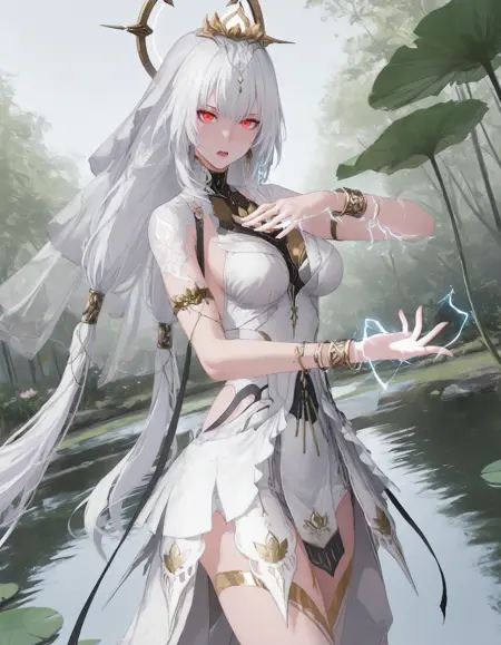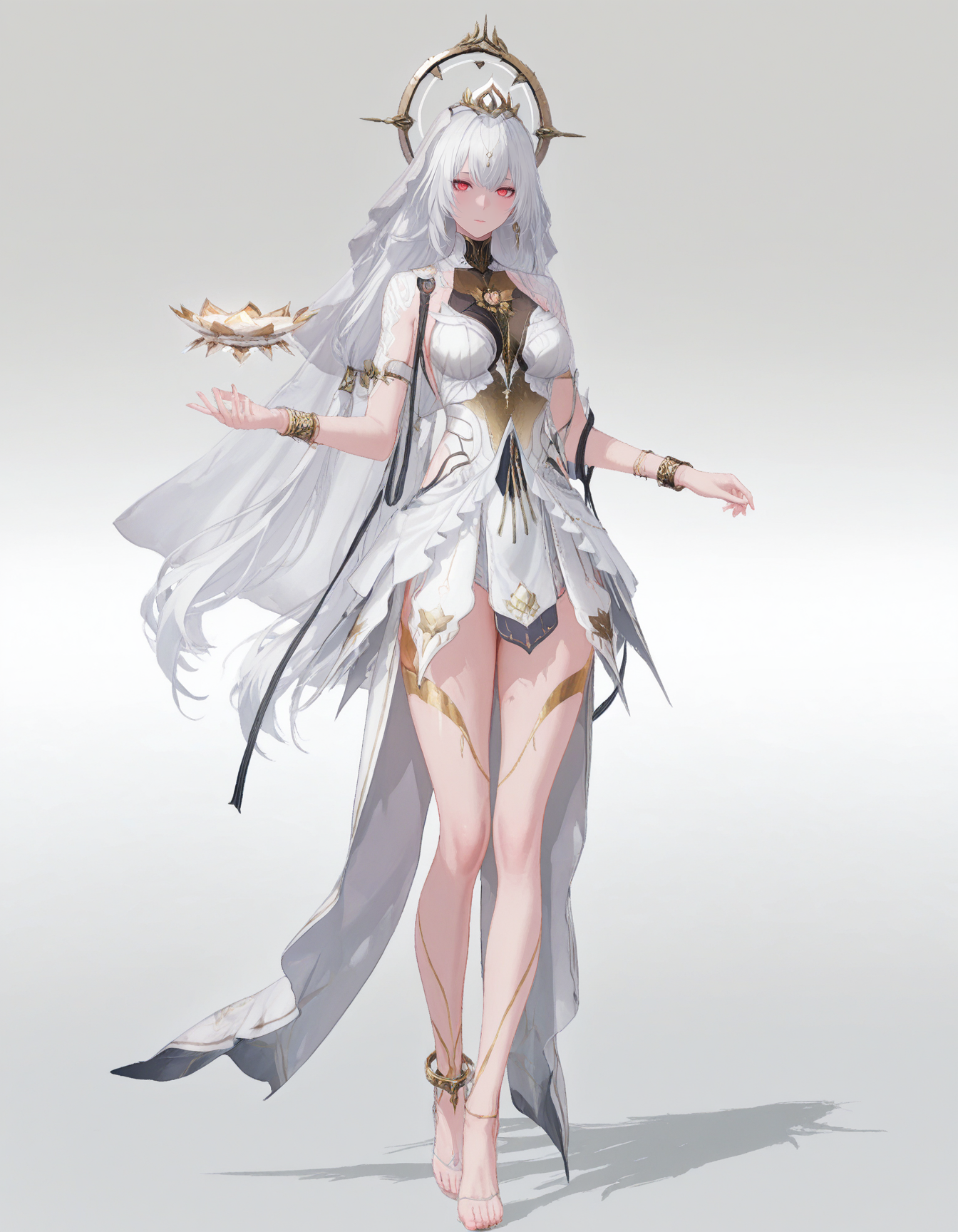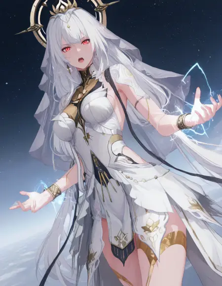 mai_pgr_liv_lgx,(aged_up:1.5),very_long_hair,low_twintails,white_hair,red_eyes,white_veil,white_dress,bracelet,mechanical_halo,barefoot,floating