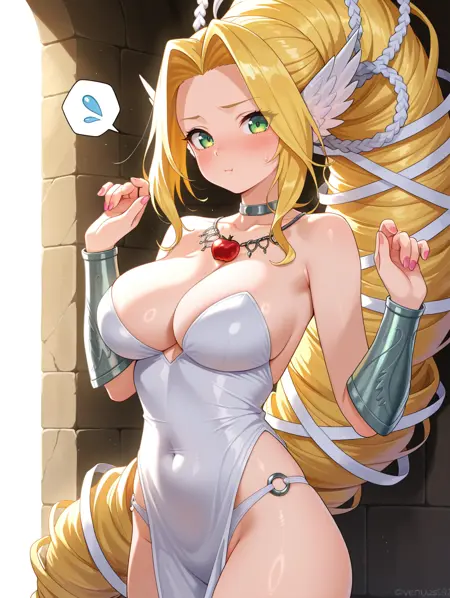 标签(服装):遮住眼睛,苹果项链,发带,眼罩,白色无肩带连衣裙,银色护臂,O型环内裤,骨盆帘幕,银色装甲靴,