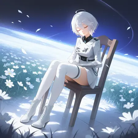 FemMcDNA, Fmc_2nd, 白髪, 短髪, 赤い目, アホ毛, 軍服, 白いジャケット, ジャケット, 白いスカート, スカート, 黒いサッシュ, チェーンベルト, 白い袖, 長袖, 非対称の手袋, 肘まで覆う手袋, 白い手袋, 腕のアーマー, 銀色のアーマー, 白いタイツ, タイツ, 黒いシャツ, ジャケットの下のシャツ, 交差した紐のブーツ, 白いブーツ, ハイヒールブーツ,