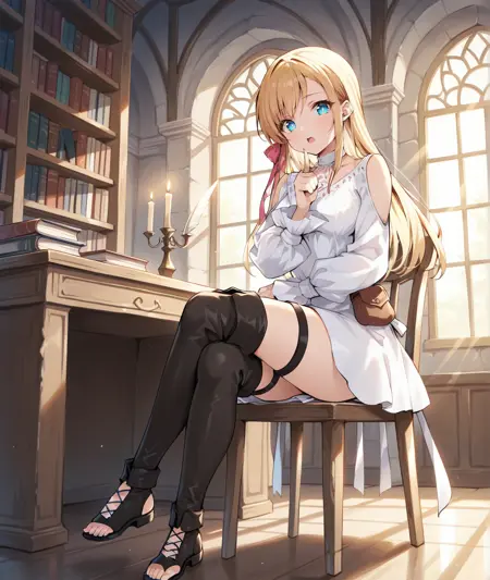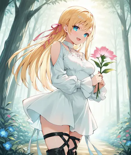린 오라클 오브 라이트 태그: RyneBase, 파란 눈, 빛나는 눈, 금발, 긴 머리, 땋은 머리, 분홍색 머리 리본, 흰색 목걸이, 클라비클, 중간 크기의 가슴, 흰색 드레스, 짧은 드레스, 어깨 절개, 옷 절개, 풍성한 긴 소매, 손목을 넘는 소매, 검은 신발, 허벅지 스트랩, 허벅지 부츠, 샌들, 발가락이 드러난 신발,