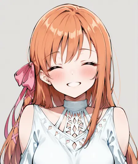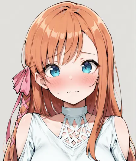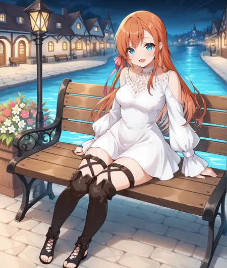 린 태그: RyneBase, 파란 눈, 주황색 머리, 긴 머리, 땋은 머리, 분홍색 머리 리본, 흰색 목걸이, 클라비클, 중간 크기의 가슴, 흰색 드레스, 짧은 드레스, 어깨 절개, 옷 절개, 풍성한 긴 소매, 손목을 넘는 소매, 검은 신발, 허벅지 스트랩, 허벅지 부츠, 샌들, 발가락이 드러난 신발,