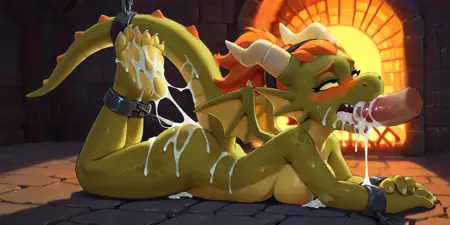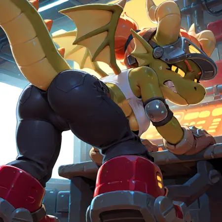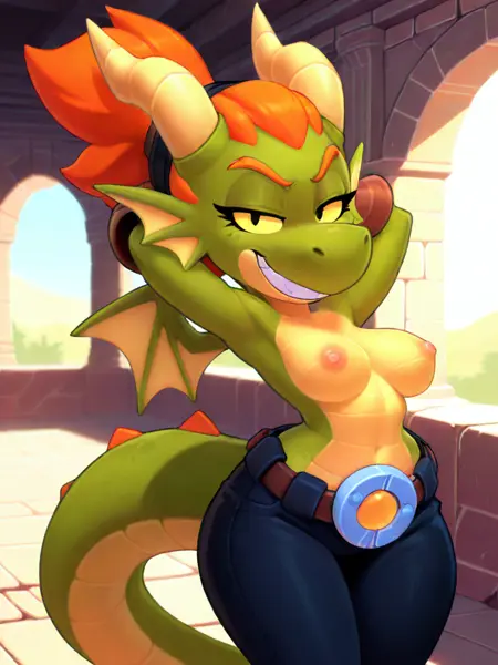 학습된 키워드: 드래곤, 드래곤 뿔, 주황색 머리카락, 꼬리, 녹색 비늘, 작업용 장갑, 빨간 부츠, 흰색 크롭탑, 검은 청바지, 지느러미 귀, 날개, 벨트 버클, 팔꿈치 패드, 헤드밴드