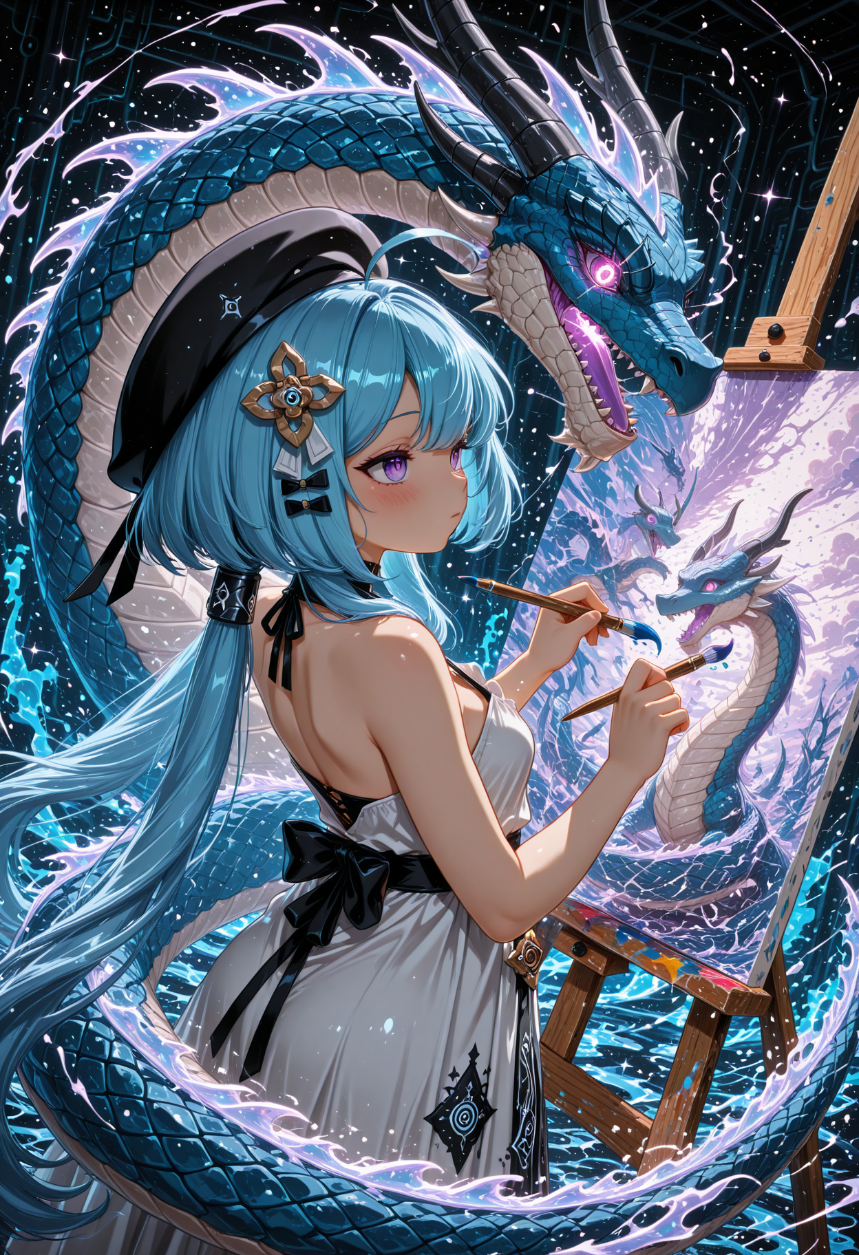 ✔ トリガー: イーゼルで絵を描くアーティスト、筆を手に