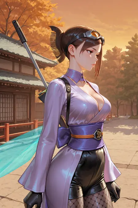 hsui_1st, 1girl, solo, 短い髪, 茶色の髪, 髪止め, 頭にゴーグル, 日本風の服, 紫のカラー, 長袖, グローブ, 正絹, ショートパンツ, 翼, オレンジ色のシンボル, フィッシュネットのタイツ