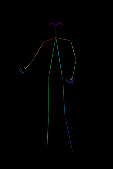 OpenPoseのボーン画像と線画で、女性(男性も可能です)がやや特殊なポーズで長剣を持っている姿を表現しています。