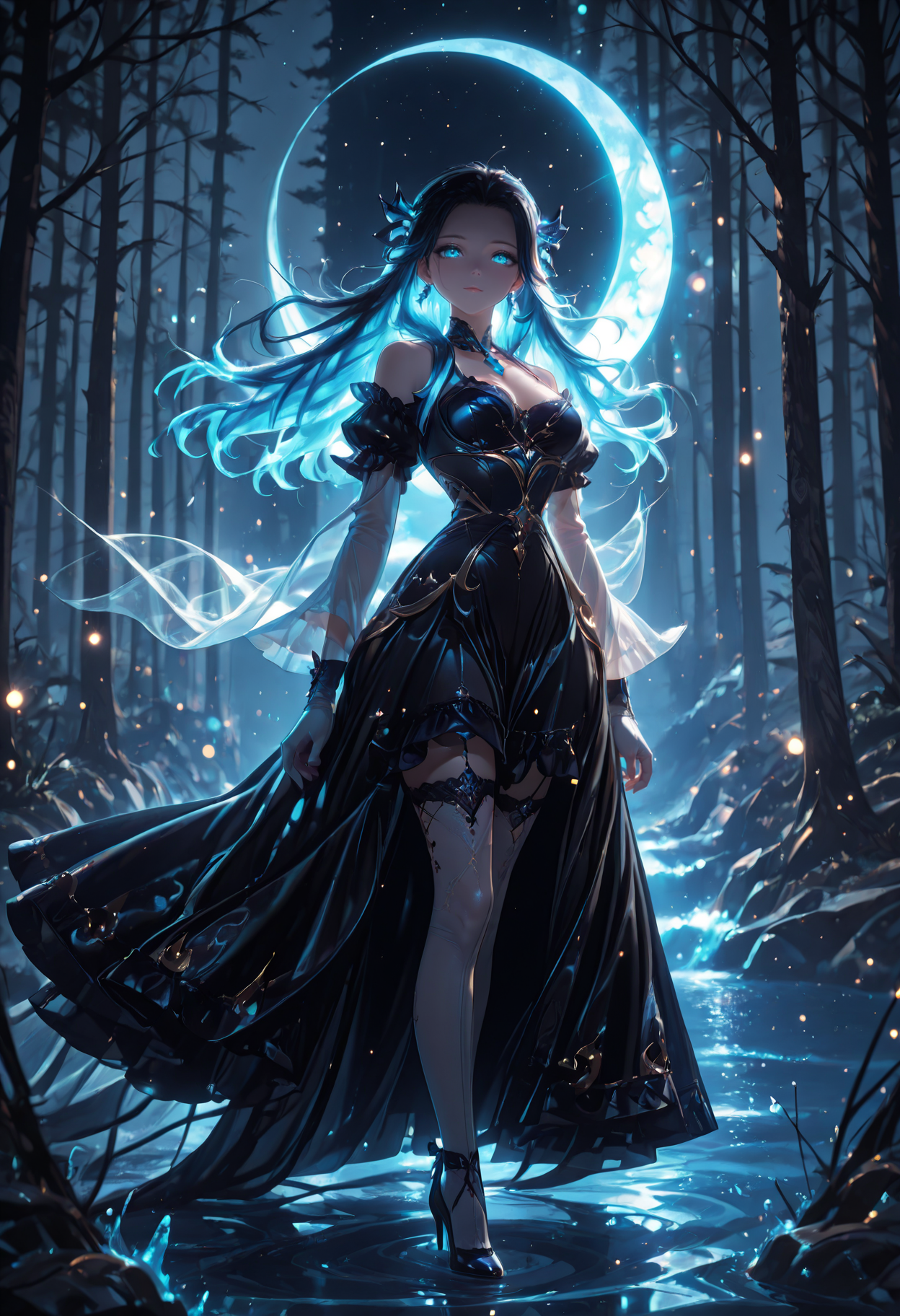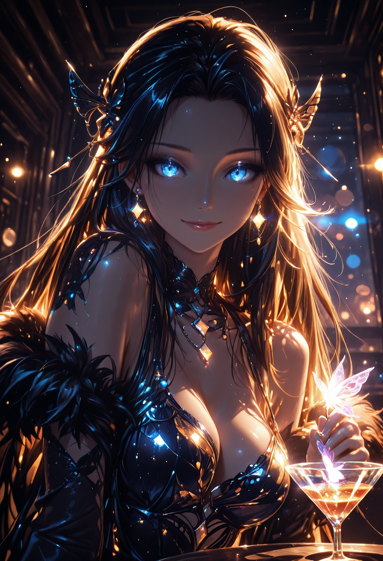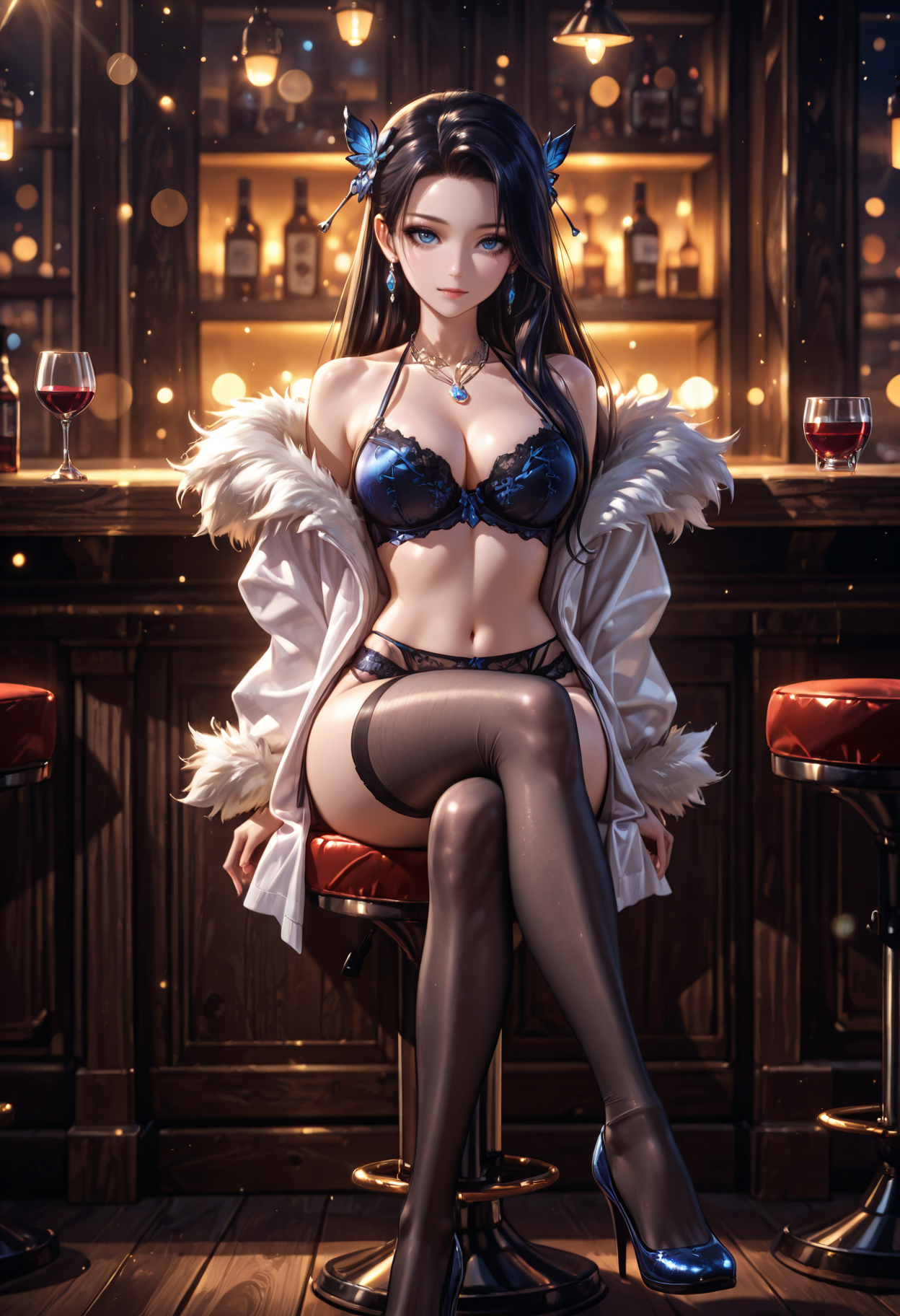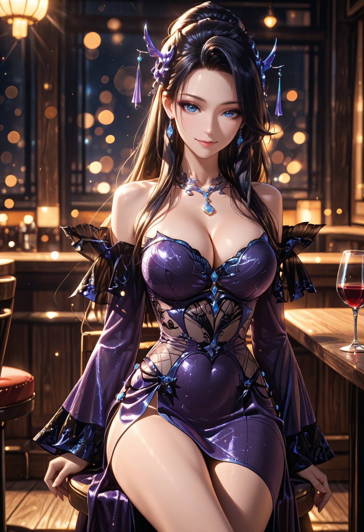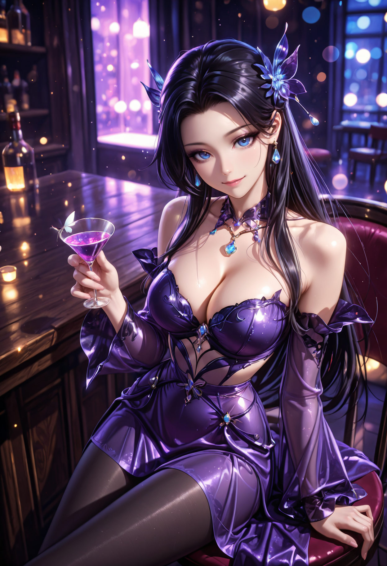yanglingji_purplenightgownxl, 파란 눈, 검은 머리, 긴 머리, 나비 모양 머리 장신구, 목걸이, 귀걸이, 입술, 보라 야간복, 보라 허리 망토, 어깨 노출, 가슴 노출, 검은 팬티스타킹, 어깨 드레스, 보라 투명 분리 소매, 팔찌, 옷 컷아웃, 보라 하이힐,