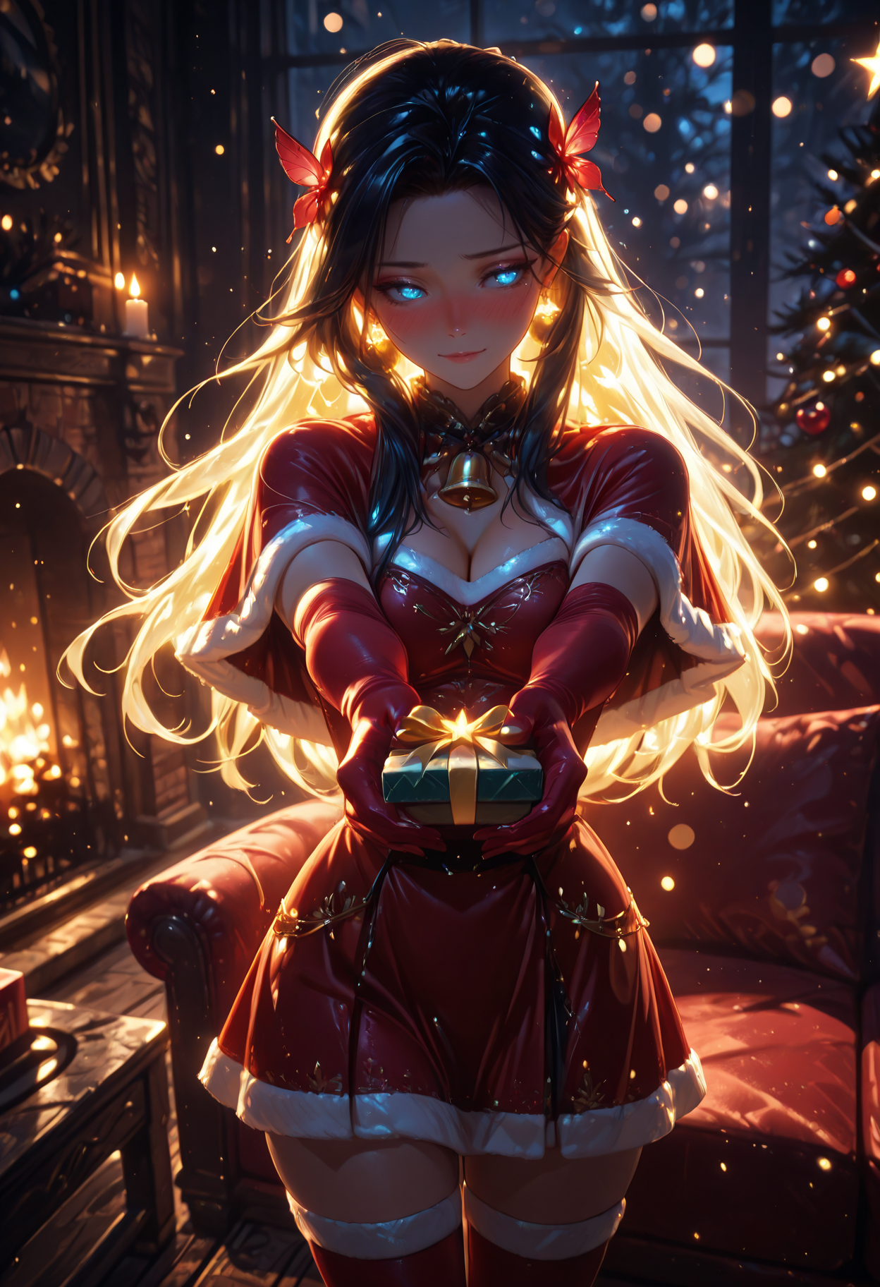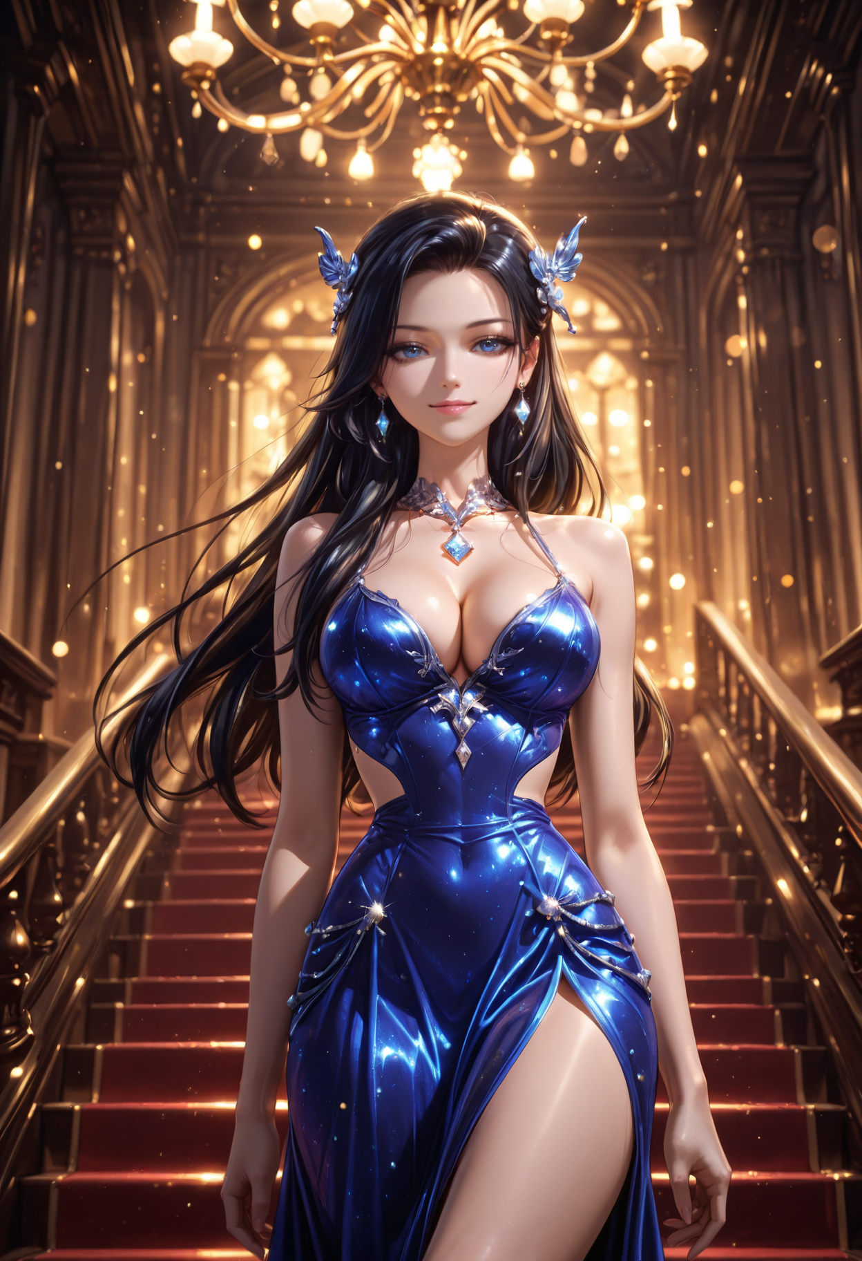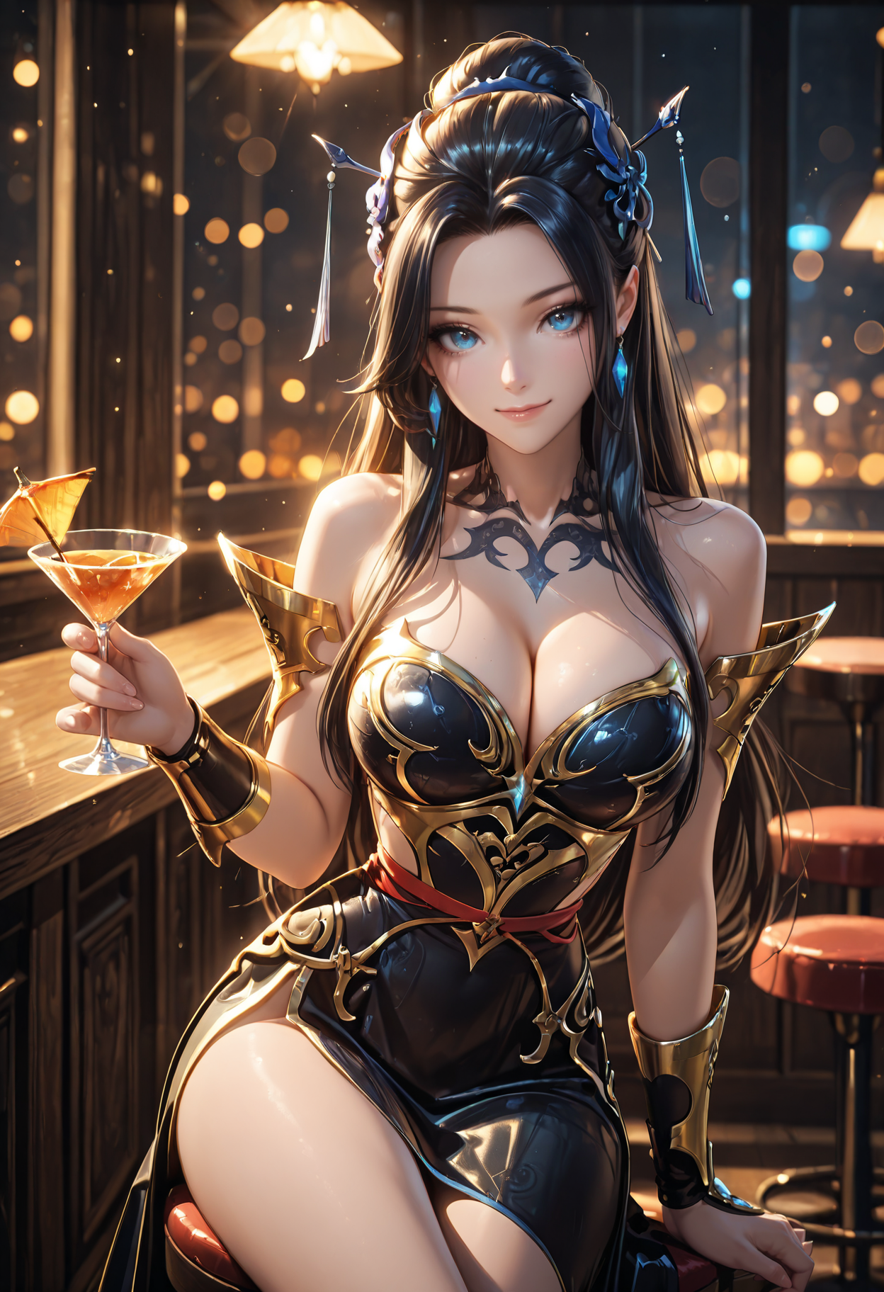 yanglingji_goldendressxl, 파란 눈, 검은 머리, 머리 땋기, 측면 머리카락, 긴 머리, 머리 장신구, 귀걸이, 입술, 검은 드레스, 황금 갑옷 드레스, 어깨 드레스, 가슴 노출, 어깨 노출, 가슴 문신, 황금 팔 보호대, 황금 손목 팔찌, 측면 슬릿, 다리 노출