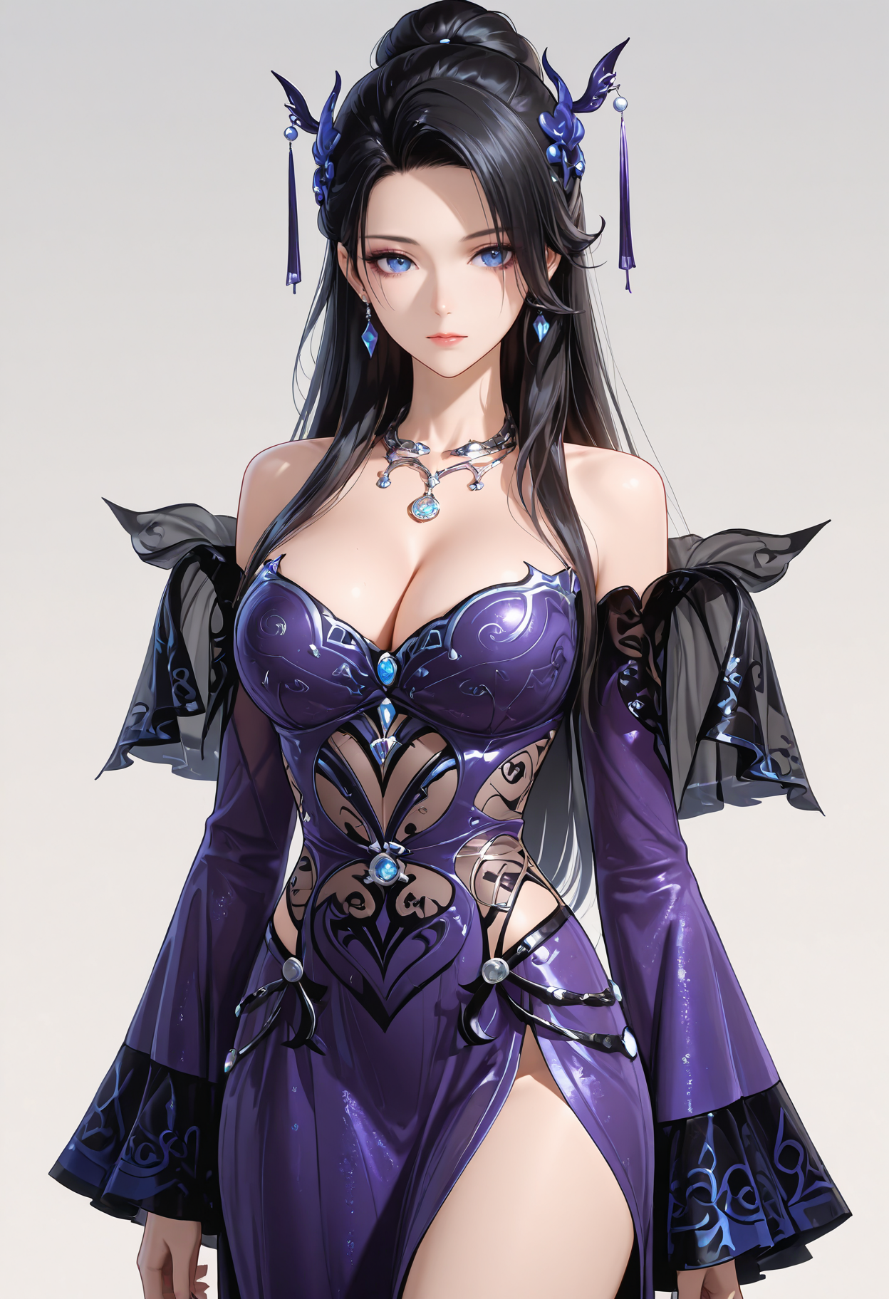 yanglingji_purpledressxl, 파란 눈, 검은 머리, 머리 땋기, 긴 머리, 목걸이, 날개 모양 머리 장신구, 귀걸이, 입술, 보라 드레스, 분리된 소매, 어깨 드레스, 투명한 드레스 레이어, 넓은 소매, 측면 슬릿, 어깨 노출, 다리 노출, 가슴 노출
