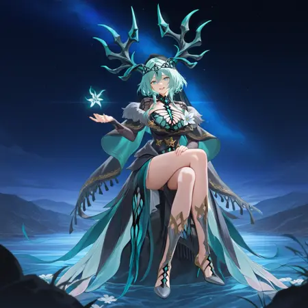 LadyNifleDNA, 아쿠아 헤어, 땋은 머리, 짧은 머리에 긴 머리카락, 아쿠아 눈, 분홍색 동공, 원형 머리장식, 헤어 장식, 뿔, 검은 베일, 베일, 가슴 노출, 긴 드레스, 검은 드레스, 허리 캡, 골반 커튼, 가슴 문신, 검은 칼라, 칼라 보석, 검은 샤그, 샤그(의상), 긴 소매, 검은 소매, 문신, 티올 브라, 브라 노출, 흰색 꽃, 드레스 꽃, 털 장식, 어깨 노출 캐플릿, 검은 캐플릿, 양면 원단, 종, 문장, 프린지 장식, 금색 신발보호대, 하이힐, 회색 신발, 금색 신발 밑창,