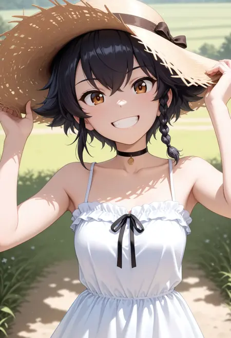 トリガー: 1girl, solo, looking at viewer, short hair, black hair, side braid, brown eyes,
