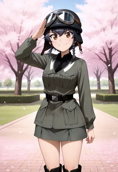 アウフィット2: anzio軍服、黒い頭部装具、ヘルメット、ゴーグルを頭に装着、頭部装具にゴーグル、長袖、ドレッシーシャツ、黒いシャツ、ワイングカラー、ネクタイ、グレーのジャケット、エンブレム、黒いベルト、グレーのスカート、ペンシルスカート、ミニスカート、黒い靴、膝上ブーツ