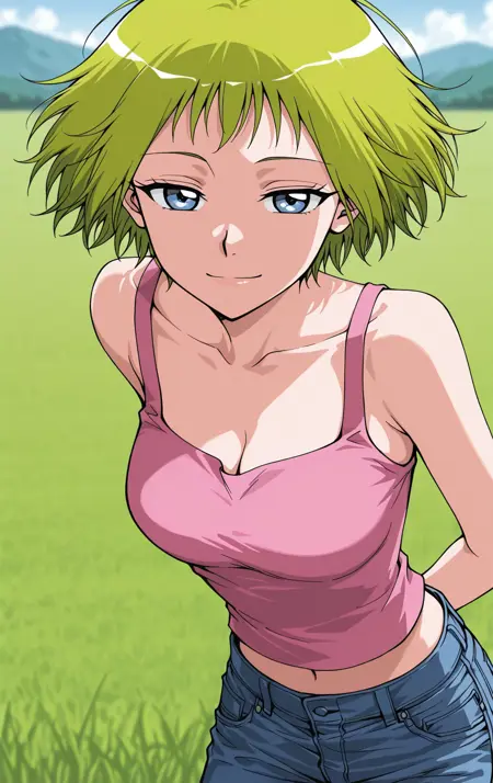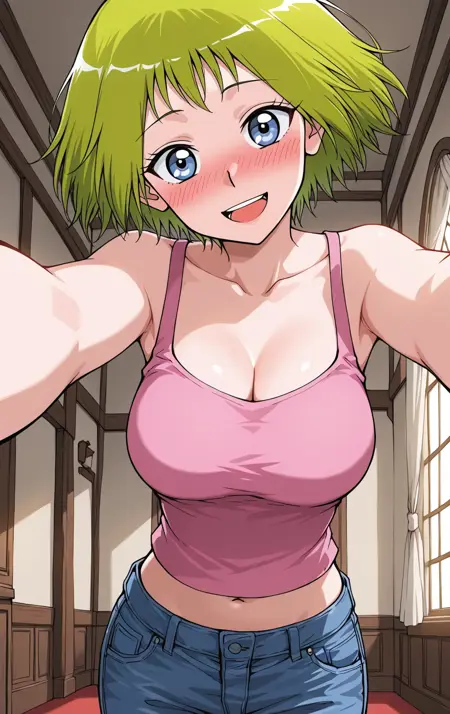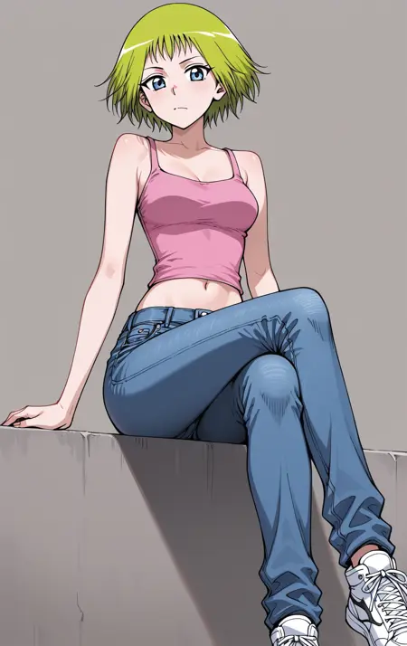 Xiaozi_服装,粉色背心,细肩带上衣,露脐,蓝色牛仔裤,牛仔裤,白色运动鞋