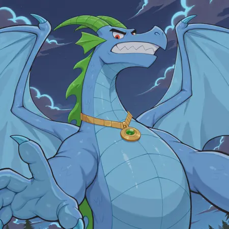 긍정적 프롬프트: DoratheaDG, 털이 있는 여자, 포악한, 비늘 있는, 드래곤, 녹색 뿔, 검은 눈썹, 빨간 눈, 검은 동공, 파란 몸체, 파란 비늘, 밝은, 파란 몸체, 연한 파란 비늘, 이톤 몸체, 이톤 비늘, 드래곤 날개, 연한 파란 안쪽 날개, 긴 꼬리, 금색 목걸이, 녹색 펜던트
