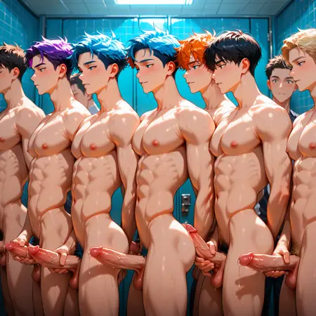 4boys, different boys, different hair colors, different hair styles, different skin tones, group focus, standing together, waiting, masturbating, holding penis, side view, looking at main boy, waiting for gangbang, cuddling,