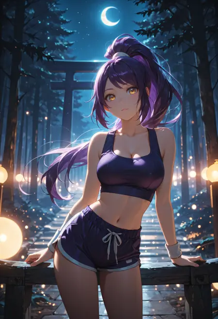 purple tank top, sports bra, bare shoulders, cleavage, grey sweatband, grey sweatband left arm, white sweatband, white sweatband right arm, wristband, midriff, navel, purple gym shorts, white ribbon, white socks, high tops, sneakers,
