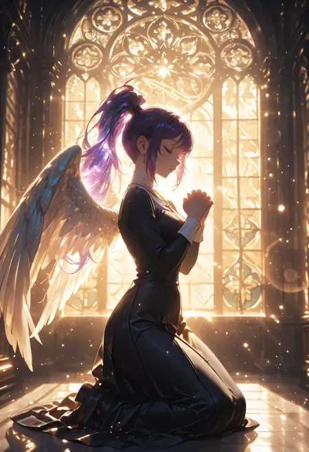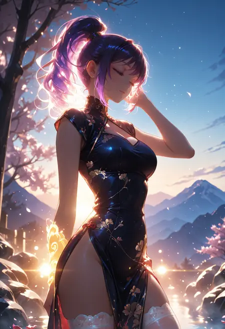 tangxuanxl, yellow eyes, purple hair, long hair, high ponytail, sidelocks,