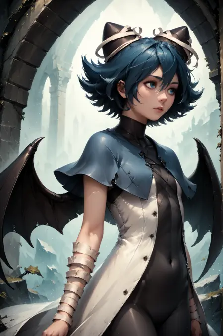 Standard outfit/look Prompt: serene_riviera, short_hair, blue_capelet, wings, white_coat, black_bodysuit, black_headwear, bandages, std_outfit
