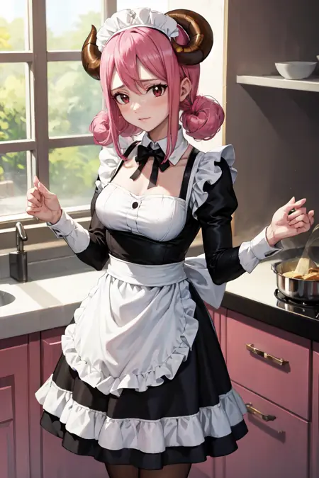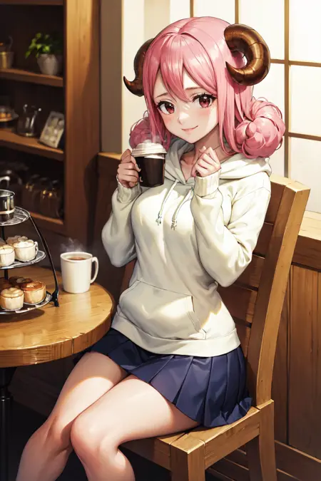 描述她的标准外观时使用: "wool hair, medium hair, sheep horns, pink eyes"。