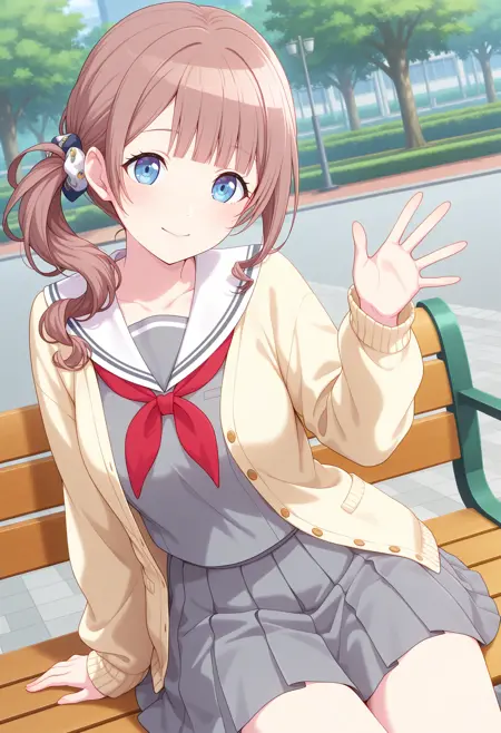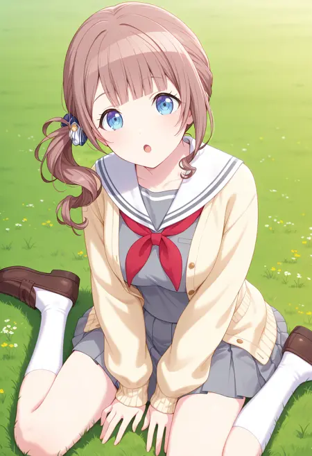 outfit1aahonami, long hair, brown hair, side ponytail, blue eyes, school uniform, white sailor collar, red neckerchief, grey shirt, yellow cardigan, long sleeves, pleated skirt, grey skirt