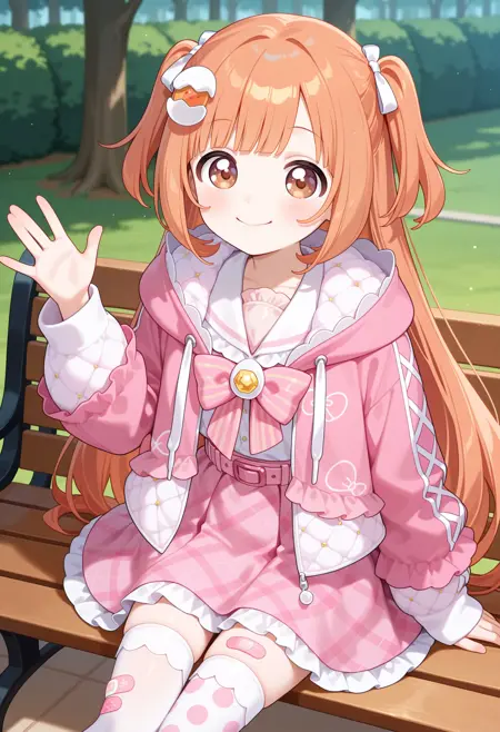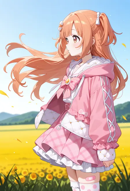 outfit2bbtamako, 긴 머리, 주황색 머리, 양 옆으로 올린 머리, 머리 리본, 머리 장식, 갈색 눈, 선원 칼라, 분홍색 리본, 흰색 셔츠, 후드 자켓, 분홍색 자켓, 긴 소매, 벨트, 체크 무늬 치마, 분홍색 치마, 다리에 반창고, 점무늬 하의, 흰색 허벅지 양말