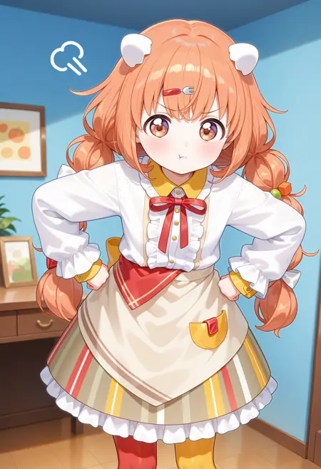 outfit1aatamako, 긴 머리, 주황색 머리, 쌍둥이 땋은 머리, 머리핀, 갈색 눈, 목 끈, 중앙 프릴, 칼라 셔츠, 흰색 셔츠, 긴 소매, 허리 앞치마, 세로 줄무늬 치마, 맞지 않는 하의, 빨간 팬티스타킹, 노란 팬티스타킹
