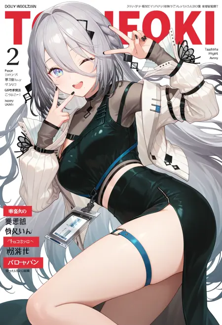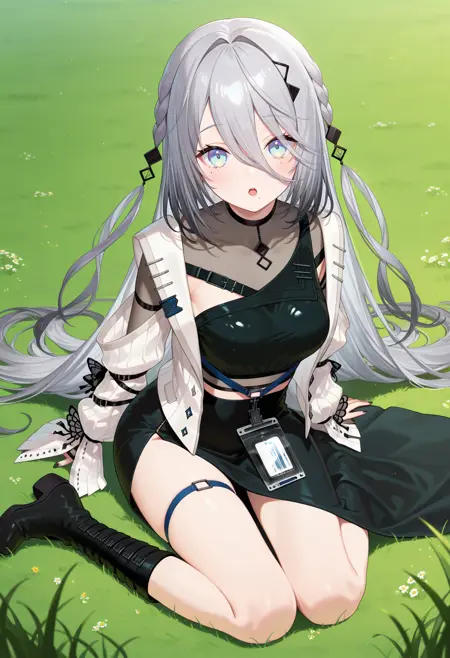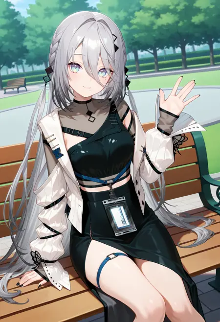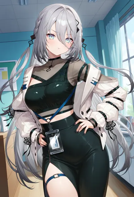 outfit1aasophia, long hair, grey hair, side braid, hair ornament, mole, see-through, black shirt, white jacket, long sleeves, lanyard, midriff, long skirt, black skirt, side slit, thigh strap
