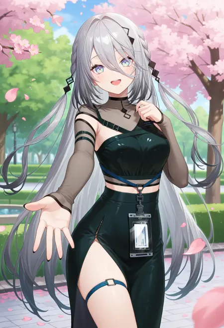 outfit1-1aasophia, long hair, grey hair, side braid, hair ornament, mole, see-through, black shirt, see-through sleeves, lanyard, midriff, long skirt, black skirt, side slit, thigh strap