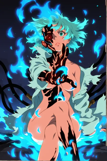 timamad, 흰 셔츠, 녹색 벨트, 바지, 가슴 상처, 파란 불,