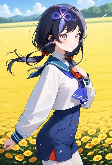 outfit1-1aanei, long hair, black hair, streaked hair, low twintails, hair ornament, fangs, sailor collar, neckerchief, white shirt, long sleeves, high-waist shorts, blue shorts, white pantyhose